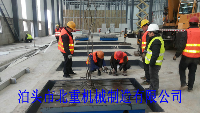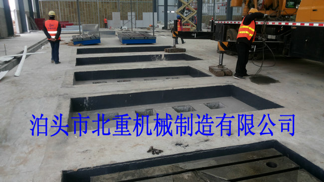 我公司為西門子電機制造的6件2500*4000電機試驗平臺安裝中.電機試驗平臺表面帶有T型槽,方便固定實驗設備.T型槽工作臺采用預埋的安裝形式,這樣的優(yōu)點是:1.不會出現平臺在實驗震動下的位移.2.減小震動輻射范圍.3.使試驗平臺的壽命和實驗效果大大提高.